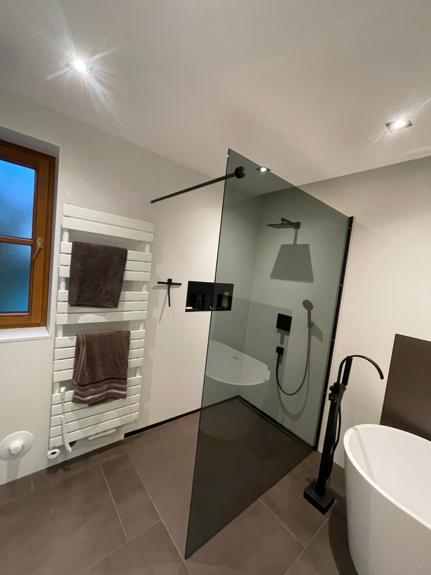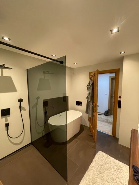 Das Highlight ist das grau gehaltene Duschglas, sowie die schwarzen, Flächenbündigen Ablagen in der Dusche sowie bei der Badedwanne